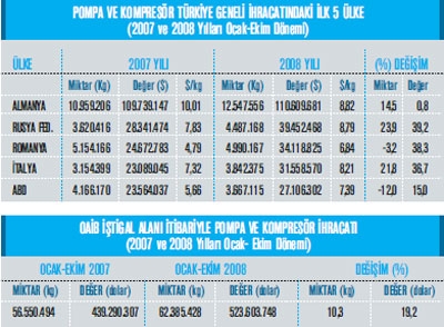 Türkiye makine ve aksamları ihracat kayıt rakamları incelendiğ inde pompa ve kompresör ihracatımızın 2008 yılının ilk 10 aylık döneminde geçtiğimiz yı- lın aynı zaman dilimine göre yüzde 19,2 oranında değer bazı nda yükseldiği görülüyor. 2007 yılının Ocak-Ekim döneminde 439 milyon 290 bin dolar olan pompa ve kompresör ihracatımız 2008 yılının Ocak- Ekim döneminde ise 523 milyon 603 bin dolar olmuş. Pompa ve kompresör ihracatı- mızın en fazla olduğu ülke ise Almanya. Söz konusu ülkeye 2007 yılının Ocak-Ekim döneminde 109 milyon 739 bin dolarlı k pompa ve kompresörler ihracatı yapılmışken 2008 yılı- nın Ocak-Ekim dönemine gelindiğ inde ise yüzde 0,8 oranında artışla 110 milyon 609 bin dolarlık değer yakalanmış. Pompa ve kompresörler ihracatı mızın en büyük ikinci pazarı ise Rusya Federasyonu. Bu ülkeye 2007 yıllının ilk 10 aylık döneminde 28 milyon 341 bin dolarlık pompa ve kompresörler ihracatı gerçekleştirilmişken 2008 yılının aynı dönemine gelindiğinde yüzde 39,2 oranı nda değer artışıyla 39 milyon 452 bin dolar seviyesi yakalanmı ş. Pompa ve kompresörler ihracatımızın en fazla olduğu üçüncü pazar ise Romanya. Söz konusu ülkeye 2007 yılının Ocak-Ekim döneminde 24 milyon 672 bin dolarlık pompa ve kompresörler ihracatı söz konusu iken 2008 yılının Ocak- Ekim döneminde ise yüzde 38,3 oranında artış sağlanarak 34 milyon 118 bin dolar seviyesine ulaşılmış. Pompa ve kompresörler ihra- catımızın en hızlı artış gösterdi- ği pazar ise Fransa olmuş. Fransa’ya geçtiğimiz yılın Ocak-Ekim döneminde 10 milyon 710 bin dolarlık pompa ve kompresörler ihracatı yapılmı şken 2008 yılının eş zaman dilimine gelindiğinde yüzde 51,6 oranında artış gerçekleşerek bu mal grubu için ihracatı- mız 16 milyon 235 bin dolar olarak gerçekleşmiş.