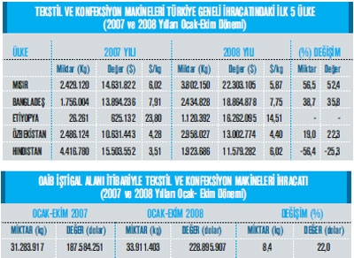 Ülkemiz tekstil ve konfeksiyon makineleri ihracatı 2008 yılının ilk 10 aylık döneminde geçtiğimiz yılın aynı dönemine göre yüzde 22 oranında artış göstermiş durumda. 2007 yılının Ocak-Ekim döneminde 187 milyon 584 bin dolar olan tekstil ve konfeksiyon makineleri ihracatımız 2008 yılının Ocak- Ekim dönemine gelindiğinde ise 228 milyon 895 bin dolar olmuş. Tekstil ve konfeksiyon makineleri ihracatımız ülkeler bazında incelendiğinde ise Mısır’ın birinci sırada yer aldığı görülüyor. Söz konusu ülkeye 2007 yı- lının ilk 10 aylık döneminde 14 milyon 631 bin dolarlık tekstil ve konfeksiyon makineleri ihracatı gerçekleştirilmişken 2008 yılının aynı döneminde ise yüzde 52,4 oranında değer artışı yakalanarak 22 milyon 303 bin dolar seviyesine ulaşıldı. Tekstil ve konfeksiyon makineleri ihracatımızın ikinci en büyük pazarı ise Bangladeş. Söz konusu ülkeye 2007 yılının Ocak-Ekim döneminde 13 milyon 894 bin dolarlık tekstil ve konfeksiyon makineleri ihracatı söz konusu iken 2008 yılının Ocak-Ekim döneminde ise yüzde 35,8 oranında yükseliş kaydedilerek 18 milyon 864 bin dolar ihracat gerçekleştirilmiş. Bangladeş’in ardında ise üçüncü sırada Etiyopya yer alıyor. Etiyopya’ya 2007 yılının ilk 10 aylık döneminde 625 bin dolarlı k tekstil ve konfeksiyon makineleri ihracatı yapılırken 2008 yılının aynı dönemine gelindi- ğinde ise ihracat 16 milyon 262 bin dolar seviyesine yükselmiş.