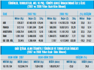 Ülkemiz türbinler ve turbojetler ihracatı 2008 yılının ilk 10 aylık sürecinde geçtiğimiz yılın aynı dönemine göre değer olarak yüzde 24,6 oranında artış göstermiş. 2007 yılının Ocak- Ekim döneminde 152 milyon 364 bin dolar olan türbinler ve turbojetler ihracatı 2008 yılının Ocak-Ekim döneminde 189 milyon 878 bin dolar olmuş. Türbinler ve turbojetler ihracatı mız ülkeler bazında incelendi- ğinde ise ABD’nin birinci sırada yer aldığı görülüyor. ABD’ye 2007 yılının ilk 10 aylık döneminde 87 milyon 482 bin dolarlık türbinler ve turbojetler ihracatı söz konusu iken 2008 yılının aynı dönemine gelindi- ğinde ise bu değer yüzde 31,1 oranında artış göstererek 114 milyon 702 bin dolar olmuş. ABD’nin ardından bu mal grubu içinde en fazla ihracat gerçekleştirilen ikinci ülkenin ise Fransa olduğu görülüyor. Fransa’ya 2007 yılının Ocak- Ekim döneminde 11 milyon 981 bin dolar türbinler ve turbojetler ihracatı yapılırken 2008 Ocak-Ekim döneminde ise yüzde 57,4 oranında yükseliş yaşanarak 18 milyon 857 bin dolarlık değer artışı yakalanmı ş. Türbinler ve turbojetler ihracatımızın en büyük üçüncü pazarı ise Avusturya olmuş. Avusturya’ya 2007 yılının ilk 10 aylık döneminde 8 milyon 849 bin dolarlık türbinler ve turbojetler ihracatı söz konusu iken 2008 yılının Ocak-Ekim dönemine gelindiğinde ise yüzde 25,4 oranında artış kaydedile- rek 11 milyon 101 bin dolar olmuş. Türbinler ve turbojetler ihracatımızın en fazla artış gösterdiğ i ülke ise Avustralya olmuş. Bu ülkeye 2007 yılının Ocak-Ekim ayında 570 bin dolarlı k türbinler ve turbojetler ihracatı gerçekleştirilmişken 2008 yılının aynı dönemine gelindiğ inde ise bu mal grubundaki ihracatımız yüzde 195,8 oranında artarak 1 milyon 686 bin dolar olarak kaydedilmiş.
