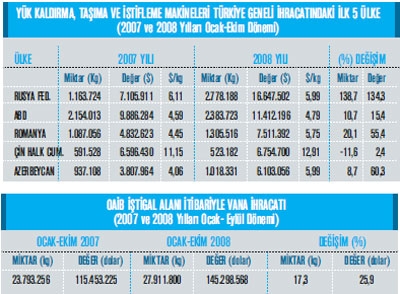 YUK KALDIRMA, TAŞIMA VE İSTİŞEME MAKİNELERİ   Türkiye geneli makine ve aksamları ihracatı kayıt rakamları incelendiğinde yük kaldırma, taşıma ve istişeme makineleri ihracatımızın 2007 yılının Ocak-Ekim döneminde 115 milyon 453 bin dolar iken 2008 yılının Ocak-Eylül dönemine gelindiğinde ise bu değer yüzde 25,9 oranında artış göstererek 145 milyon 298 bin dolar olmuş. Yük kaldırma, taşıma ve istişeme makineleri ihracatımız ülkeler bazında incelendiğinde ise Rusya Federasyonu’nun ilk sırada yer aldığı görülüyor. Söz konusu ülkeye 2007 yılının Ocak-Ekim döneminde 7 milyon 105 bin dolarlık yük kaldırma, taşıma ve istişeme makineleri ihracatı yapılmışken 2008 yılının Ocak-Ekim döneminde yüzde 134,3 artışla 16 milyon 647 bin dolar seviyesi yakalanmış. Rusya Federasyonu’nun ardından, bu mal grubu için en fazla ikinci ihracat gerçekleştirilen ülkenin ise ABD olduğu görülüyor. ABD’ye 2007 yılının ilk 10 aylık döneminde 9 milyon 886 bin dolarlık yük kaldırma, taşıma ve istişeme makineleri ihracatı söz konusu iken 2008 yılının aynı dönemine gelindiğinde ise yüzde 15,4 artışla 11 milyon 412 bin dolar ihracat yapılmış. Yük kaldırma, taşıma ve istişeme makineleri ihracatımızın en büyük üçüncü pazarı ise Romanya. Bu ülkeye 2007 yılının Ocak-Ekim döneminde 4 milyon 832 bin dolarlık yük kaldırma, taşıma ve istişeme makineleri ihracatı yapılmışken 2008 yılının aynı döneminde gelindiğinde ise yüzde 55,4 de ğer artışıyla 7 milyon 511 bin dolar rakamı yakalanmış. Yük kaldırma, taşıma ve istişeme makineleri ihracatımızın en fazla arttığı ülke ise Mısır olmuş. 2007 yılının Ocak-Ekim döneminde Mısır’a 1 milyon 896 bin dolar değerinde yük kaldırma, taşıma ve istişeme makineleri ihracatı söz konusu iken 2008 yılının Ocak-Ekim döneminde ise yüzde 149,8 oranında artış yaşanarak bu mal grubundaki ihracatımız 4 milyon 738 bin dolar olmuş.