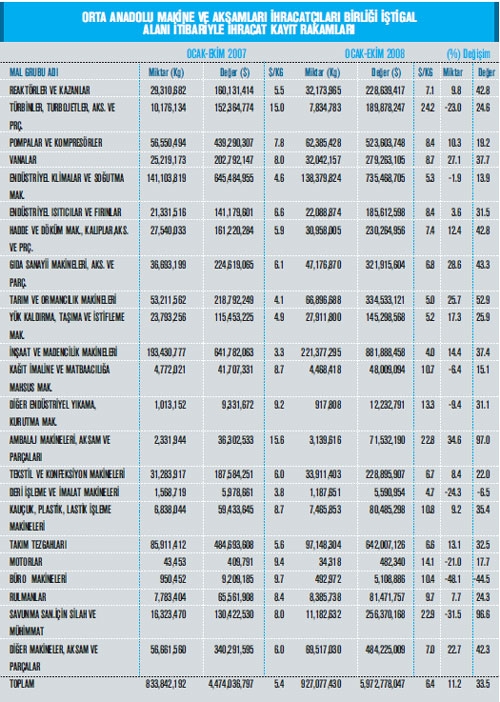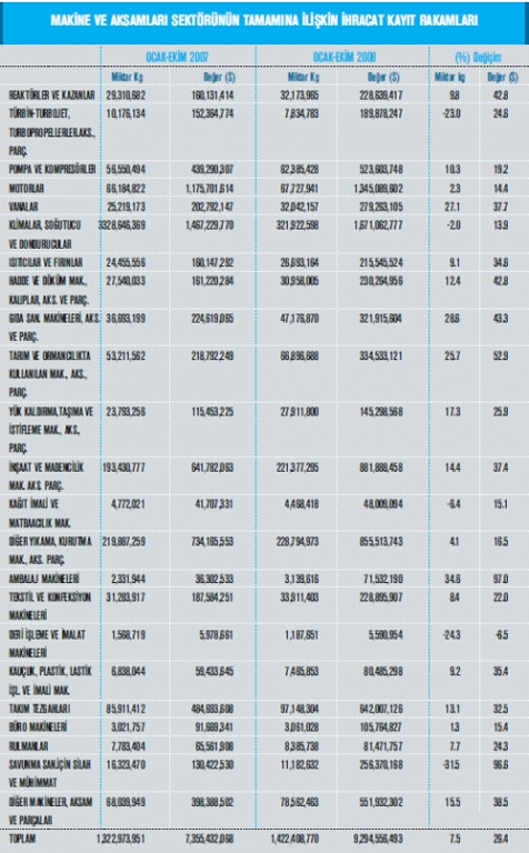 Turkiye geneli makine ihracatı 2008 yılının ilk 10 aylık doneminde gectiğimiz yılın aynı donemine gore yuzde 26 oranında artarak 9 milyar 294 milyon dolar oldu.Makine sektörü toplamı, 84. faslın tamamı ve 84. fasıl dışı Orta Anadolu Makine ve Aksamları İhracatçıları Birliği iştigal alanı itibariyle 2008 yılının ilk on aylık döneminde ihracatı mız bir önceki yılın eş dönemine kı- yasla yüzde 26 artarak 9 milyar 294 milyon dolar seviyesine ulaştı.