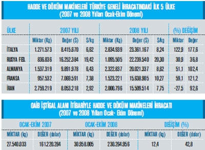 Hadde ve döküm makineleri ihracatımız 2008 yılının Ocak- Ekim döneminde de yükselişine devam ediyor. 2007 yılının ilk 10 aylık döneminde 161 milyon 220 bin dolar olan hadde ve döküm makineleri ihracatı mız 2008 yılının aynı dönemine gelindiğinde ise yüzde 42,8 oranında artarak 230 milyon 264 bin dolar olmuş. Hadde ve döküm makineleri ihracatımız ülkeler bazında incelendiğ inde ise İtalya’nın ilk sırada yer aldığı görülüyor. Bu ülkeye 2007 yılının Ocak-Ekim döneminde 8 milyon 415 bin dolarlık hadde ve döküm makineleri ihracatı yapılmışken 2008 yılının eş zaman dilimine gelindiğinde ise yüzde 177,6 oranında artışla bu mal grubu için 23 milyon 361 bin dolarlık ihracat gerçekleştirilmiş. İtalya’nı n ardından en fazla ihracat gerçekleştirdiğimiz ikinci ülkenin ise Rusya Federasyonu olduğu görülüyor. Rusya Federasyonu’na 2007 yılının ilk 10 aylık döneminde 16 milyon 252 bin dolarlık hadde ve döküm makineleri ihracatı söz konusu iken 2008 yılının Ocak- Ekim dönemine gelindiğinde ise bu değer yüzde 36,8 oranı nda artış göstererek 22 milyon 239 bin dolar olmuş. Hadde ve döküm makineleri ihracatı mızın en fazla olduğu ikinci pazar ise Rusya Federasyonu. Bu ülkeye 2007 yılının Ocak- Ekim döneminde 16 milyon 252 bin dolarlık hadde ve döküm makineleri ihracatı yapılmı şken 2008 yılının Ocak-Ekim döneminde ise yüzde 36,8 oranı nda yükseliş kaydedilerek 22 milyon 239 bin dolar seviyesi kaydedilmiş. Ülkeler bazında hadde ve döküm makineleri ihracatımızın en hızlı artış gösterdiği ülke ise İtalya olmuş. İtalya’ya gerçekleştirilen hadde ve döküm makineleri ihracatı 2007 yılının ilk 10 aylık sürecine göre 2008 yılının eş zaman dilimine göre yüzde 117,6 oranında artış göstermiş. İtalya’nın ardından ise bu mal grubu için en hızlı ihracat artışının yaşandığı ülke Fransa olmuş. Söz konusu ülkeye 2007 yılının Ocak-Ekim döneminde 7 milyon 69 bin dolarlık hadde ve döküm makineleri ihracatı gerçekleştirilmişken 2008 yılının aynı dönemine gelindiğinden yüzde 121,2 artışla 15 milyon 638 bin dolar değerine ulaşılmış.