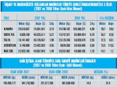 Türkiye inşaat ve madencilikte kullanılan makineler ihracatı geçtiğimiz yılın Ocak-Ekim dönemine göre 2008’in eş zaman diliminde yüzde 37,4 oranı nda yükseliş kaydetmiş. 2007 yılın Ocak-Ekim döneminde bu mal grubu ihracat 642 milyon 782 bin dolar iken 2008 yılının Ocak-Ekim döneminde ise 881 milyon 888 bin dolar olmuş. İnşaat ve madencilikte kullanı- lan makineleri ihracatımız ülkeler bazında incelendiğinde ise Almanya’nın birinci sırada yer aldığı görülüyor. Almanya’ya 2007 yılının Ocak-Ekim döneminde 76 milyon 501 bin dolarlık inşaat ve madencilikte kullanılan makineler ihracatı söz konusu iken 2008 yılının Ocak-Ekim dönemi için bu de- ğer yüzde 39,3 oranında artış kaydederek 106 milyon 580 bin dolar olmuş. İnşaat ve madencilikte kullanılan makineler ihracatımızın en büyük ikinci pazarı ise Rusya Federasyonu olarak kaydedilmiş. Rusya Federasyonu’na inşaat ve madencilik makineleri ihracatı mız 46 milyon 525 bin dolarken 2008 yılının eş zaman dilimine gelindiğinde yüzde 82,8 yükseliş yakalanarak ihracatı mız 85 milyon 64 bin dolar olmuş. Rusya Federasyonu’nun ardından ise 58 milyon 928 bin dolar inşaat ve madencilik makineleri ile İtalya geliyor. 2007 yılının Ocak- Ekim döneminde İtalya’ya 36 milyon 126 bin dolarlık inşaat ve madencilik makineleri ihracatı yapılmışken 2008 yılının Ocak-Ekim dönemine gelindi- ğinde ise yüzde 63,1 oranında artış kaydedilmiş. İnşaat ve madencilikte kullanılan makineler ihracatımızın en hızlı artı ş gösterdiği ülke ise Libya olmuş. Söz konusu ülkeye 2007 yılının ilk 10 aylık döneminde 12 milyon 298 bin dolarlık inşaat ve madencilikte kullanılan makineler ihracatı gerçekleştirilmişken 2008 yılının eş zaman dilimine gelindiğinde ise yüzde 181,6 artışla 34 milyon 630 bin dolar seviyesi yakalanmış.