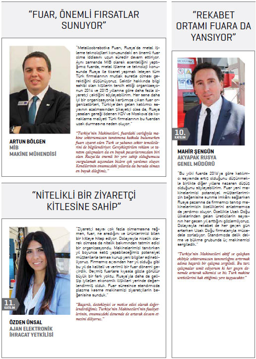 Fuarla ilgili değerlendirmelerde bulunan MAİB ve Türkiye’nin Makinecileri Yönetim Kurulu Başkanı Adnan Dalgakıran, Rusya ile ekonomik işbirliğinin artmasının iki ülkenin de yararına olduğuna değinerek, Moskova’da önemli iş fırsatları bulunduğunu söyledi. Uluslararası metal endüstrisini Moskova’da buluşturan fuar çerçevesinde Türkiye’nin Makinecileri’nin gerçekleştirdiği çalışmaların Türkiye’nin dış pazarlardaki etkinliğine katkı sağladığını vurgulayan Dalgakıran şunları kaydetti: “Rusya, ihracat stratejimiz içinde önemli bir ticaret ortağı. İki ülke arasında önemli fırsat alanları var. Ekonomik ilişkilerimizin tekrar hareketlendiği Rusya’da bu fuar vesilesiyle çok iyi ağırlandık. Üretilen makinelerin kalitesi, teknolojisi ve hizmet anlayışıyla kendini dünyaya kanıtlamış rekabetçi bir sektörüz. Rusya gibi stratejik bir pazarı, en çok ihracat gerçekleştirdiğimiz ilk beş ülkeden biri yapacak potansiyele sahibiz. Moskova’da Türk sanayisini başarıyla temsil eden sektörümüzün, geliştirdiği yeni iş birlikleriyle ihracatımıza katkı yapacağı görüşündeyim”.