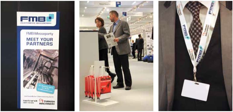 Bad Salzuflen/Almanya’da 6-8 Kasım tarihleri arasında düzenlenen FMB (The Supplier Show of Mechanical Engineering) Fuarı’na MTG, Makine Sanayii Sektör Platformu üyesi Akışkan Gücü Derneği (AKDER), Endüstriyel Otomasyon ve Sanayiciler Derneği (ENOSAD), Plastik Sanayicileri Derneği (PAGDER), Tekstil Makine ve Aksesuarları Sanayicileri Derneği(TEMSAD), Türk Tarım Alet ve Makineleri İmalatçıları Birliği (TARMAKBİR) ve Türk Pompa ve Vana Sanayicileri Derneği (POMSAD) yetkilileriyle birlikte katıldı. Fuarda ayrıca Türk makine sektörünün tanıtımı için MTG tarafından giriş kartı, billboard, yaka kartı, çanta, katalog gibi çeşitli mecralara reklamlar verildi.