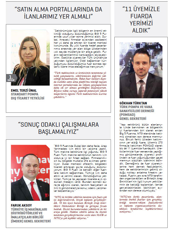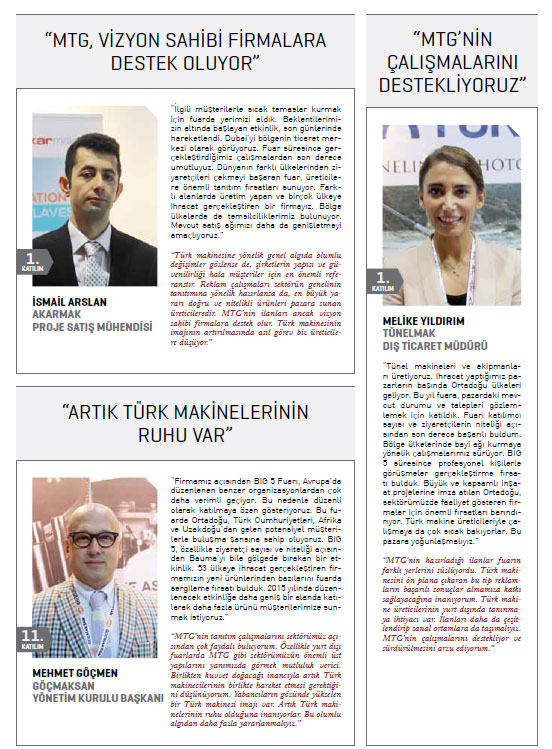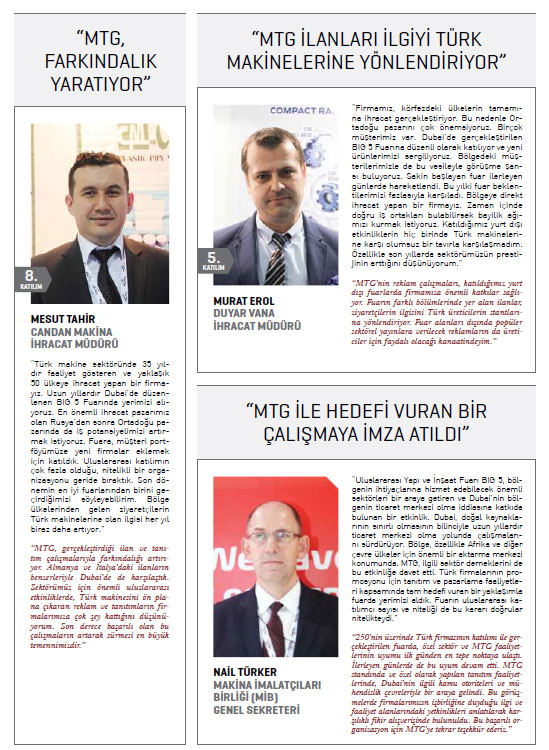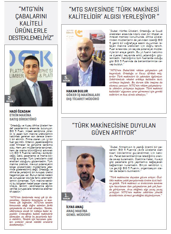 MTG gibi çatı bir kuruluşun yurt dışındaki faaliyetlerde yer almasının kendilerine güç verdiğini ifade eden Türk makine üreticileri ise, dört gün süresince başarılı çalışmalara imza atılan BIG 5 Fuarının bölgesel iş hacimlerini artmasına katkı sağlayacağı görüşünde birleşti.