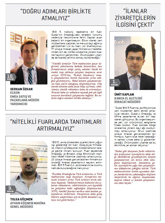 için diğer sektörlerden farklı olarak özel bir konuma sahiptir. Ülke olarak gelişmiş bir makine sektörüne sahipseniz sırtınız yere gelmez. Bunun bilinciyle hareket eden Bakanlığımız üretici firmalara elinden gelen tüm desteği sağlama çabası içindedir. BIG 5 Fuarına da katılarak üreticilerimizi yalnız bırakmadık. Dubai’de ilgili bakanlık yetkilileri ile görüşme fırsatı bulduk. Bu çerçevede hem devlet otoritesinin hem de özel sektör temsilcilerinin Türk üreticiler ile işbirliği konusuna çok sıcak baktığını gördük. Ayrıca Dubai pazarında süreklilik arz etmenin önemini de bir kez daha kavradık. Eğer şartlar müsaade ederse, firmalarımızın burada bağlantı noktalarının ya da ticari ofislerinin bulunmasının çok faydalı olacağını gözlemledik. Başta makine sektörü olmak üzere, Türk üreticilerin mevcut avantajlarımızı kullanarak iyi sonuçlar alması en büyük dileğimizdir.”