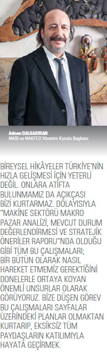 Göreve geldiğimiz günden itibaren yapacağımız her işin sistematik, hedefleri belirlenmiş ve ölçülebilir olmasına dikkat ettik. Aynı zamanda bu çalışmaları kurumsallaştırmayı da amaçladık. Kişilerle kaim olan bir şey yapmak istemedik. Bu noktada da yıllar önce; “Sektör hangi konumda, teknolojiye sahip olma konusunda nerede? Güçlü-zayıf yanları ile avantajları ve dezavantajları nelerdir?” soruları çerçevesinde bir durum tespiti ortaya koyduk. Tabii ki yıllar geçiyor. Geçtikçe de değişiklikler yaşanıyor ve o durum değişikliklerini tekrar analiz ediyoruz. Dolayısıyla bu çalışma da geçmişte yaptıklarımızın devamı niteliğinde. Önce durumu tespit ediyor sonra da küresel rekabet içerisinde neler yapmamız gerektiğinin analizini yapıyoruz. Tabii bunun için de pazardaki yerimiz, mevcut durumumuz çok iyi tahlil ediliyor. Akabinde de MAİB ve MAKFED olarak hep birlikte çalışmalarımıza bir rota çiziyoruz. Bir başka koldan da siyaset ve bürokrasiye de makine sektörünün gelişmesi için üstlenmeleri gereken görevlerin neler olması gerektiği konusunda fikir oluşturuyoruz. Netice itibarıyla söz konusu çalışma da 10 yılı aşkın zamandır devam eden sürecin bir parçası.