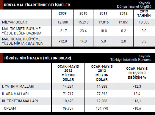 beklentileri de aşağı yönlü revize edildi ve en son Temmuz ayı itibariyle dünya ekonomisi için yüzde 2,4 büyüme beklentisi açıklandı. Büyümenin yavaşlamasında özellikle euro bölgesindeki küçülme ile birlikte gelişen ülkelerin büyüme temposundaki yavaşlama da etkili oluyor. Gelişen ülkeler için büyüme beklentisi 2013 yılı için yüzde 5,0’dir. Gelişen ülkelerdeki yavaşlama yatırım malı ve makine talebini de olumsuz etkiliyor. Dünya ekonomisindeki yavaşlama ve büyümenin zayıflaması, dünya ticaretindeki gelişmeyi olumsuz etkiledi. Nitekim 2010 ve 2011 yıllarında dünya mal ticaretinde yaşanan hızlı genişlemenin ardından 2012 yılında büyüme sadece yüzde 0,2 düzeyinde kaldı. Dünya mal ticareti 2012 yılında 17,85 trilyon dolar ile 2011 yılı ile aynı gerçekleşti. 2013 yılında dünya mal ticaretinde değer olarak yüzde 3 ile yine oldukça zayıf bir büyüme bekleniyor. Bu büyüme, ticarete konu olan malların fiyatlarındaki durağanlık ve gerileme ile birlikte büyük ölçüde miktar bazındaki artıştan kaynaklanacak.