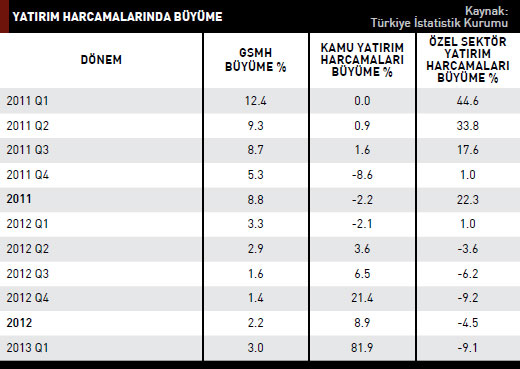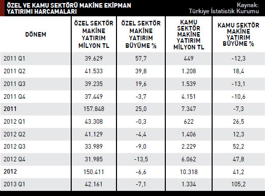Türkiye ekonomisinde ise Merkez Bankası’nın ve ekonomi yönetiminin uyguladığı ekonomiyi soğutma ve dengelenme politikaları son iki yıldır belirleyici oluyor. Bu politikalar sonucu büyüme 2012 yılında yüzde 2,2’ye indi. Ekonomide yaşanan bu soğumadan en çok etkilenen ise özel sektör yatırımları oldu. 2011 yılında yüzde 22,3 artan özel sektör yatırım harcamaları 2012 yılında yüzde 4,5 geriledi. Özel sektör yatırımlarında gerileme, 2013 yılı ilk çeyrek döneminde de yüzde 9,1 ile devam etti.. Kamu yatırım harcamalarının ise son iki çeyrekte önemli ölçüde artığı görüldü. Ancak esas belirleyici olan özel sektör yatırımlarında beş çeyrek dönemdir süren küçülme yatırım malı makine üreticilerini olumsuz etkiliyor. Yatırım harcamaları içinde en önemli kalemi oluşturan makine ve ekipman harcamaları ile özel sektör makine yatırımları son altı çeyrektir küçülüyor. Özellikle 2012 yılında özel sektör makine yatırımlarında önemli bir küçülme yaşandı. Küçülme yüzde 7,1 ile yeni yılın ilk çeyrek döneminde de sürdü. Kamu sektöründeki makine yatırımlarında görülen artış ise özel sektördeki küçülmeyi telafi edecek büyüklükte değildir. Özel sektörün makine ve ekipman yatırımlarındaki küçülme, sektörün iç piyasadaki satışlarının azalmasına, buna bağlı olarak da üretim ölçeğinin düşmesine neden oluyor. Bu eğilim ihracat içinde ölçek maliyetlerinin artması anlamına geliyor. Türkiye’de yatırım iştahındaki zayıflık ve yatırımlardaki gerilemenin bir başka göstergesi yatırım malı ithalatında görülen düşük artış hızıdır. İlk beş ayda Türkiye’nin toplam ithalatı yüzde 8,1, tüketim malı ithalatı yüzde 14,1 ve ara malları ithalatı yüzde 7,9 artmışken yatırım malları ithalatı sadece yüzde 4,2 artış gösterdi.