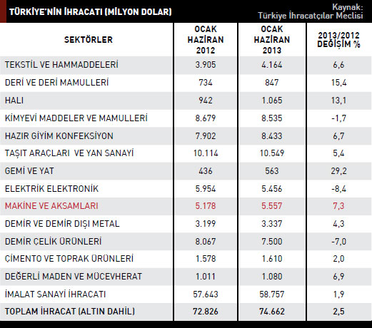 İlk 6 ayda toplam ihracat artışı yüzde 2,5 oldu. Bu yıl altın ihracatı düşüyor ve geçen yılın altında kalması bekleniyor. Yıllık olarak toplam ihracat artışı negatife dönecek. İmalat sanayi ihracat artışı ise ilk ayda yüzde 1,9 oldu. İmalat sanayi içinde ihracat performansları sektörler arasında önemli farklılıklar gösterdi. Makine sektörü ise ilk 6 ayda ihracatını yüzde 7,3 artırdı ve daha büyük ölçekli ihracat gerçekleştiren sektörler arasında ilk sırada yer aldı. Tekstil sektörü ihracatı yüzde 6,6 hazır giyim konfeksiyon sektörü ihracatı yüzde 6,7 ve taşıt araçları ile yan sanayi ihracatı yüzde 5,4 artış gösterdi. Kimyevi maddeler, elektronik ve demir çelik sektörü ihracatları ise geriledi. Bu çerçevede değerlendirildiğinde makine sanayinin ihracat artış oranı önemli bir başarı olarak görülmelidir. Dünya ticareti içinde en zayıf performansı ve en önemli yavaşlamayı yatırım malları ticareti gösteriyor. Küresel ölçekte yatırım iştahının gerilediği bir ortamda makine sanayi ihracat artışının ilk sırada yer alması son derece önemlidir.