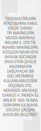 Ekskavatörlerin atası olarak kabul edilen “shovel” tipi makinelerin mucidi Amerikalı William S. Otis’tir. Bir inşaat firmasının ortağı olan Otis, üstlendiği demir yolu projelerini zamanında bitirerek ceza ödememek için hafriyat işlerini hızlandırmanın değişik yollarını arıyordu. O yıllarda gelişimi hızlanan buharlı makinelerin, kütleleri insan veya hayvan gücünden daha etkin şekilde kaldırmasını sağlayacak bir güç üretiminde kullanılabileceğini düşünen Otis, mühendis arkadaşı Charles H. French ile birlikte 1835 yılında dünyanın ilk buhar gücüyle çalışan shovelini geliştirdi.