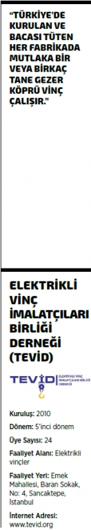 REKABETTE KALITE VE AR-GE’NIN ÖNEMLI OLDUĞUNU SÖYLEYEN ELEKTRIKLI VINÇ İMALATÇILARI BIRLIĞI DERNEĞI (TEVİD) YÖNETIM KURULU BAŞKANI OSMAN ÇAKMAK, “AR-GE’YE YATIRIM YAPARAK, TEKNOLOJIK GELIŞMELERI ÇOK YAKINDAN TAKIP EDEREK, TAMAMEN FEM STANDARTLARINDA ÜRETIM YAPIYORUZ. EĞER UYGUN TEŞVIKLER VE UCUZ FINANSMAN IMKÂNLARININ ÖNÜ AÇILIRSA, BU SEKTÖR YURT DIŞINDA DA ÖNEMLI BIR REKABET GÜCÜ OLUŞTURARAK TÜRKIYE IHRACATINA DAHA GÜÇLÜ KATKIDA DA BULUNABILIR” DIYOR.
