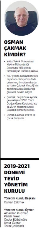 sektörünü temsil eden bir dernek olarak 2010 yılında kurulan ve günümüzde sektörün yüzde 65’ini temsil eden TEVİD üyelerinin toplam cirosu yaklaşık 300 milyon doları, istihdam ettiği kişi çalışan sayısı ise 4000’i geçmiş durumda. Geçtiğimiz 12 Ocak’ta gerçekleşen TEVİD’in 5’inci Olağan Genel Kurulunda 2019-2021 dönemi Yönetim Kurulu Başkanlığına seçilen Osman Çakmak, “Anayasa ve Kanunlar çerçevesinde ulusal ekonominin gelişmesi, kalkınması ve verimliliğin arttırılması; sosyal, kültürel ve eğitsel yaşam seviyesinin yükseltilmesine katkıda bulunmak; bu doğrultuda kaldırma makineleri sektöründe vinç üretimi, kullanımı ve satışına ilişkin sermaye, kuruluş, teknoloji iş birliğini oluşturmak ana hedefleriyle çalışmalarımıza devam edeceğiz” diyor.