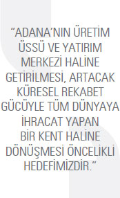 Adana’nın ihracatında lokomotif sektörler arasında tekstil ve hammaddeleri, kimyevi maddeler ve mamulleri, hububat, bakliyat, yağlı tohumlar ile mamulleri ilk üç sırada yer alıyor. Bunları sırasıyla su ürünleri ve hayvansal mamuller, çelik, mobilya, kağıt ve orman ürünleri, otomotiv endüstrisi, hazır giyim ve konfeksiyon, makine ve aksamları takip ediyor. Köklü ve güçlü sanayi geçmişine sahip Adana, yıllık 2 milyar dolarla en fazla ihracat yapan 10’uncu şehir konumundadır. Bunu yeterli görmüyoruz. Kısa ve orta vadede yıllık ihracatın 5 milyar dolar, 2023 yılında ise 15 milyar dolar seviyesine çıkarılmasını, en çok ihracat yapan iller sıralamasındaysa ilk beş arasında yer almayı hedefliyoruz. Adana’da tekstil sanayisinde çok gelişmiş modern entegre tesislere, gıda üretiminde Türkiye markalarına, makine imalat sanayisindeyse yurt dışına komple fabrikalar kurabilen işletmelere sahibiz. Firmalarımız, otomotivden elektronik karta, makineden mobilyaya, yemeklik yağdan meyve suyuna kadar yüzlerce farklı alandaki üretimiyle dünya pazarlarında talep görüyor.
