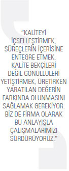 Kalite kavramını nasıl algıladığınız, ürünlerinize ve müşterilerinize nasıl yansıttığınız çok önemli. Kalite dediğimizde biz, tedarikçimizden müşterimize sevkiyata kadar olan zincirin tüm halkalarının ürettiği parça, ürün ve hizmetin öneminin anlaşılması ve ortaya çıkan ürünün beklenen fonksiyonları karşılamasını anlıyoruz. Kaliteyi içselleştirmek, süreçlerin içerisine entegre etmek, kalite bekçileri değil gönüllüleri yetiştirmek, üretirken yaratılan değerin farkında olunmasını sağlamak hedeflerimizden biri. Biraz da insan kaynaklarınızdan söz edelim.