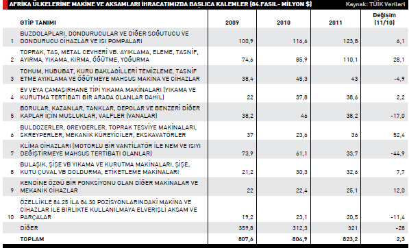 Böylelikle bahsi geçen mal grubundan 2011 yılında Afrika ülkelerine 123milyon 839 bin dolar değerinde ihracat gerçekleştirildi. İkinci sırada yer alan“Toprak, Taş, Metal Cevheri vb. Ayıklama,Eleme, Tasnif, Ayırma, Yıkama,Kırma Öğütleme, Yoğurma Makineleri”mal grubunda ise yüzde 28,1 oranındaartış yaşandı. Üçüncü sıradaki “Tohum,Hububat, Kuru Baklagilleri Temizleme,Tasnif Etme, Ayıklama ve Öğütlemeye Mahsus Makina ve Cihazlar” malgrubundan 43 milyon 93 bin dolar değerinde ihracat gerçekleştirdi.