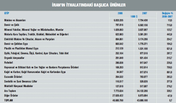 2007 yılında İran’ın en fazla ithal ettiği ürünlerin makine ve aksamları olduğu görülüyor. Söz konusu faslın toplam ithalattan aldığı pay yüzde 13,5 olup, toplam 7,75 milyar dolar değerinde ithalat gerçekleştirilmiş. İran’ın ithalatından yüzde 15 oranında pay alan demir ve çelik kaleminden ise 6,5 milyar dolar ithalat yapılmış. En fazla ithal edilen ürünler arasında üçüncü sırayı alan mineral yakıtlar, mineral yağlar ve müstahsalları, mumlar ithalatı ise bir önceki yıla göre yüzde 123,7 oranında artarak 3,6 milyar olarak gerçekleşmiş. İran’ın ithal ettiği diğer ürünler arasında motorlu kara taşıtları, traktör, bisiklet, motosiklet ve diğerleri; elektrikli makine ve cihazlar, aksam ve parçaları; demir ve çelikten eşya, plastik ve ürünleri yer alıyor.
