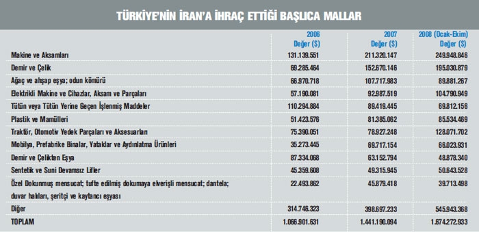 Türkiye ile İran arasındaki ticaret rakamlar incelendiğinde 2002 yılında 1,3 milyar dolar olan toplam dış ticaret hacmi yüzde 542 oranında artış kaydederek 2007 yılında 8,1 milyar dolara ulaşmış. 2007 yılında 1,4 milyar dolar olan ihracatımız 2008 yılı- nın Ekim ayı itibariyle 1,7 milyar dolar olarak gerçekleşmiş. İthalatımız ise 2007 yılında 6,6 milyar dolar iken 2008 yılının Ekim ayı itibariyle 7,5 milyar dolar olarak kaydedilmiş. İki ülke arasındaki dış ticaret 2002 yı- lında 587 milyon dolar, 2003 yılında 1.327 milyon dolar, 2004 yılında ise 1.149 milyon dolar Türkiye aleyhine açık vermiş olup, söz konusu dış ticaret dengesi 2005, 2006 ve 2007 yılları nda da açık vererek, 2008 yılının Ekim ayı itibariyle 5,8 milyar dolar ile Türkiye aleyhine açık vermiş. İki ülke arasında dış ticaretin daha yakından incelenmesi amacıyla mal grupları bazında verilere bakıldığında; 2007 yılında Türkiye’nin İran’a yaptığı toplam ihracat içinde en büyük paya sahip olan ürün 211 milyon dolar ile makine ve aksamları alıyor. Onu 152,7 milyon dolarla demir ve çelik takip etmiş. Ağaç ve ahşap eşya, odun kömürü ve elektrikli makine ve cihazlar, aksam ve parçaları da ihracattan büyük pay alan mal grupları arasında. 2007 yılında Türkiye’nin İran’dan ithalatı nda fasıl olarak birinci sırayı 6 milyar dolarlık değeriyle benzin motor yağları, fuel oil, nafta, etilen, propilen ve benzin almış. Onu sırasıyla bakır ve bakırdan eşya, plastik ve mamulleri, demir ve çelik takip ediyor. SPOT: “ 2007 yılında İran’ın en fazla ithal ettiği ürünlerin makine ve aksamları olduğu görülüyor. Söz konusu faslın toplam ithalattan aldığı pay yüzde 13,5 olup, toplam 7,75 milyar dolar değerinde ithalat gerçekleştirilmiş. ”