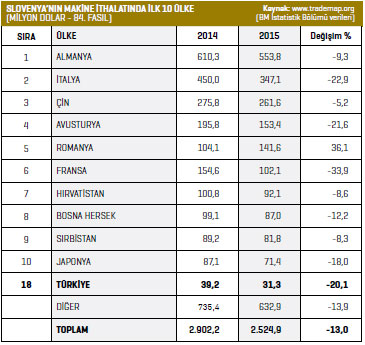 Bölümü verilerine göre, 2015 yılında yüzde 14,7 kayıpla 2,9 milyar dolar seviyesinde gerçekleşti. Bu dönemde, Almanya, Avusturya ve Hırvatistan Slovenya’nın en güçlü ticaret ortakları olurken, İtalya, Rusya, Fransa, Sırbistan, Romanya, ABD ve Polonya, Slovenya’nın makine ihracatında önemli ülkeler olmayı sürdürdü. Bu dönemde Türkiye de 28,1 milyon dolarlık alımla Slovenya’nın makine ihracatında 21’inci sırada yer aldı.