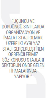 Üçüncü ve dördüncü sınıflarda organizasyon ve imalat stajı olmak üzere iki ayrı yaz stajı gerçekleştiren öğrencilerimiz söz konusu stajları sektörün önde gelen firmalarında yapıyor. 20 iş günü süren staj süresince öğrenciler firmada, hem organizasyon hem de üretim süreçlerini detaylı olarak görebiliyor. Sonrasında, firmada bulunduğu süre içerisinde edindiği tecrübeleri rapor haline getirerek bölüm hocalarına sunuyor. Öğrencileri sanayiyle koordineli çalışmaya teşvik edecek bir diğer uygulama da hayata yeni geçirdiğimiz ve Türkiye de bir ilk olma özelliği taşıyan “Sektör Danışmanlığı Projesi”dir. Proje çerçevesinde birinci sınıftan itibaren öğrenciler üç-dört kişilik gruplara ayrılarak sektörün önde gelen firmalarına atanıyor. Firmalara atanan öğrenciler firma yetkilileriyle tanıştırılıyor ve ardından belirli aralıklarla firmayı ziyaret ediyor. Firmada bulundukları süre içerisinde işleyişin ve sanayi ortamının nasıl olduğunu detaylı gözlemleme fırsatı buluyor. Bunun yanında firmanın öğrencilere verdiği projeler onlara yeni