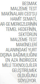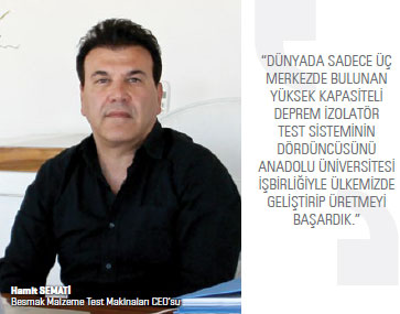 Bilim, Sanayi ve Teknoloji Bakanlığı tarafından 11 Ekim 2017’de Türkiye’nin 654’üncü Ar-Ge Merkezi olarak akredite edildiklerini aktaran Besmak Malzeme Test Makinaları CEO’su Hamit Semati, malzeme test ve kalite kontrol test cihazları sektöründe Türkiye’nin ilk Ar-Ge Merkezi olma prestijini elde ettiklerini söylüyor. Firmalarının 2001 yılından itibaren malzeme test ve kalite kontrol sistemleri, tasarım, üretim-geliştirme alanında faaliyet gösterdiğini belirten Semati, geliştirdikleri yenilikçi tasarımlarla projelerin yanı sıra mühendislik altyapısını teknoloji ve tecrübeyle birleştirerek alanında hızla büyüyen bir firma olduklarının da altını çiziyor. “Firmamız kurulduğu ilk günden bu yana sürekli gelişmeyi kendine amaç edinmiş, malzeme test sektöründe ileri teknoloji kullanarak, müşterilerine kaliteli hizmeti sunmayı prensip haline getirmiş ve bu sayede bir dünya markası olmayı başarmıştır. Dünya standartlarında ürettiğimiz malzeme test makinelerinin hem seri üretimini hem de özel tasarım Ar-Ge ürün imalatını, modern ve gelişmiş cihazlar kullanarak Ar-Ge, üretim-kalite kontrol mühendislerinin liderliğinde Ankara ve Kastamonu’da bulunan fabrikalarımızda sürdürüyoruz” diyerek devam eden Semati, üretimlerinin yüzde 70’ini ABD, Almanya ve İngiltere’de bulunan ve kendi sektöründe lider konumda olan firmalara ihraç ettiklerinin altını çiziyor. Semati, malzeme test makineleri sektöründe Orta Doğu pazarının en büyük üreticisi olduklarını da vurguluyor ve “Firma olarak yüksek Ar-Ge kabiliyeti ve bilgi birikimimiz sayesinde; yazılım, elektronik, hidrolik ve elektromekanik sistemlerden birkaçı ya da tamamını içeren yüksek teknolojiye sahip, katma değeri yüksek, Ar-Ge ve test sistemleriyle çeşitli amaçlar doğrultusunda tasarlanan sistemler geliştiriyoruz” diyor.