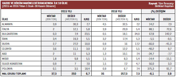 2016 yılının Ocak-Kasım döneminde Türkiye geneli hadde ve döküm makineleri sektöründe ihracat artışının en fazla yaşandığı ülke yüzde 142,2 ile Bulgaristan oldu. Listenin ikinci sırasında yüzde 91,7 ile Polonya yer alırken söz konusu ülkeyi yüzde 72,6 ihracat artışıyla İtalya üçüncü sırada izledi.