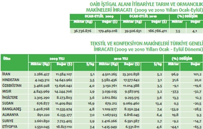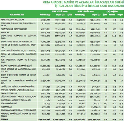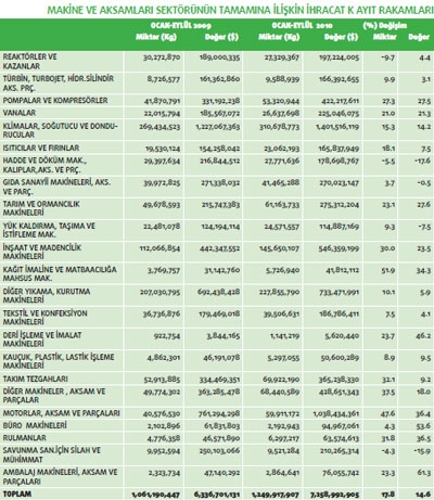 84. faslın tamamı ve 84. fasıl dışı orta anadolu makine ve aksamları ihracatçıları birliği iştigal alanı toplamından oluşan makine sektörünün tamamının ihracatı 2010 yılının ocak-eylül döneminde yüzde 14,6 oranında artarak 7 milyar 258 milyon dolara yükseldi.