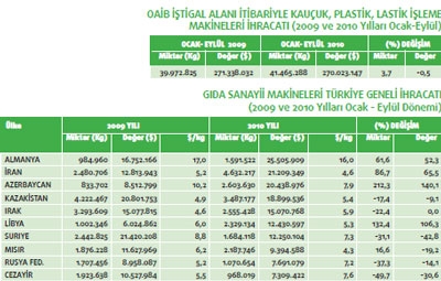Azerbaycan’a 2009 yılının Ocak-Eylül döneminde 8 milyon 512 bin dolarlık gıda sanayii makineleri ihracatı yapılırken, yüzde 140,1 gibi önemli bir artışla, ihracatımız 20 milyon 438 bin dolara yükseldi. Gıda sanayii makineleri ihracatımızın 2010 yılı Ocak-Eylül döneminde en fazla artış gösterdiği ülkelerden bir diğerinin ise Libya olduğu görülüyor. Söz konusu ülkeye 2009 yılının Ocak-Eylül döneminde 6 milyon 24 bin dolarlık gıda sanayii makineleri ihracatımız söz konusu iken 2010 yılının aynı dönemine gelindiğinde ise bu değer yüzde 106,3 oranında artış kaydederek 12 milyon 430 bin dolar ihracat düzeyi yakalandı.Gıda sanayii makineleri ihracatı gerçekleştirdiğimiz ilk 10 ülke arasındaki Irak’a iharacat aynen kalırken diğer ülkelerde ise düşüşler yaşandı. Irak’a 2009 yılının Ocak-Eylül döneminde 15 milyon 77 bin dolarlık gıda sanayii makineleri ihracatı gerçekleştirilirken, bu rakam 2010 yılının aynı döneminde 15 milyon 70 bin dolar oldu.Bu mal grubu içerisinde ihracat gerçekleştirdiğimiz bir diğer ülke olan Rusya’ya ise 2009 yılının Ocak-Eylül döneminde 8 milyon 958 bin dolarlık gıda sanayii makineleri ihracatımız söz konusu iken 2010 yılının aynı dönemine gelindiğinde ise bu değer yüzde 14,1 oranında düşüş kaydederek 7 milyon 691 bin dolar ihracat düzeyine geriledi. Gıda sanayii makineleri ihracatımızda düşüş yaşanan bir diğer ülke ise Kazakistan oldu. Kazakistan’a 2009 yılının Ocak-Eylül döneminde 20 milyon 801 bin dolarlık gıda sanayii makineleri ihracatı yapılırken, 2010 yılının aynı döneminde bu rakam yüzde 9,1 düşerek 18 milyon 889 bin dolar seviyesine geriledi.