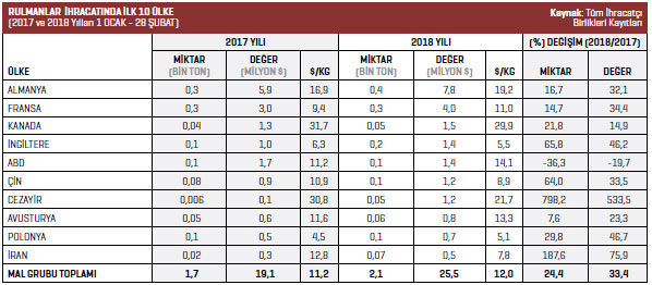 2018 yılının Ocak-Şubat döneminde Türkiye geneli rulmanlar sektöründe en fazla ihracat artışı yüzde 533,5 ile Cezayir’de gerçekleşti. Listede İran yüzde 75,9 ile ikinci, Polonya ise yüzde 46,7 ile üçüncü sırada yer aldı.