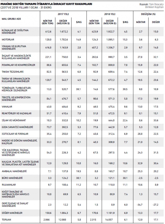 Makine sektöründe 2018 yılının Ocak- Ekim döneminde en fazla ihracat gerçekleştiren alt sektör klimalar ve soğutma makineleri oldu. 2017 yılının Ocak-Ekim döneminde söz konusu ürün grubunda gerçekleştirilen ihracatın değeri 1,6 milyar dolar seviyesindeyken, 2018 yılının aynı döneminde bu rakam yüzde 15 artarak 1,9 milyar dolar oldu. Listenin ikinci sırasında yer alan motorlar kaleminde 2018 yılının Ocak-Ekim döneminde gerçekleştirilen ihracatın değeri 1,8 milyar dolar oldu. 2017 yılının aynı döneminde bu rakam 1,7 milyar dolardı. Motorlar mal grubundaki ihracat artışı yüzde 6,3 seviyesinde kaydedildi. En fazla ihracat gerçekleştiren üçüncü kalem ise yıkama ve kurutma makineleri oldu. Söz konusu kalemde 2017 yılının Ocak-Ekim döneminde 1,1 milyar dolar seviyesinde ihracat gerçekleştirilirken, 2018 yılının aynı döneminde bu rakam yüzde 14,8 artışla 1,3 milyar dolara yükseldi.