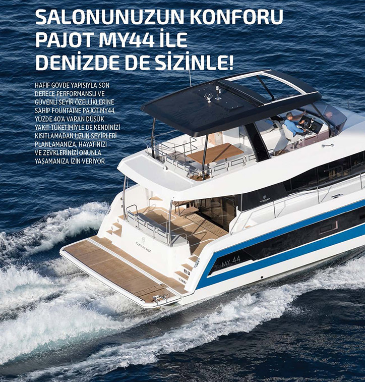 Geçtiğimiz yıl Avrupa Yılın Yatı Ödüllerinde, 14 metre altı en başarılı motor yat seçilen Fountaine Pajot MY44, yenilikçi tasarımı, zarif çizgileri, lüks yaşam konforu, gelişmiş üretim teknolojisi ve kullanılan kaliteli malzeme ve işçiliğiyle mükemmeli arayanları bile tatmin edecek yepyeni bir tasarım sunuyor. İç mekanlarda kullanılan doğal ışıkla birlikte geniş kokpit alanı, panoramik salon ve mutfak birleşimiyle evinizin konforunu denize taşıyan Pajot MY44, motor yat katamaranlardaki seyir zevkini zirveye taşımış.
