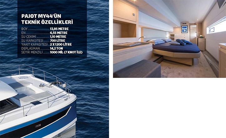 Geniş ve ferah yaşam alanlarıyla dikkat çeken Pajot MY44, hafif gövde yapısıyla son derece performanslı ve güvenli bir seyir vaat ederken, yüzde 40’a varan düşük yakıt tüketimiyle de kendinizi kısıtlamadan uzun seyirleri planlamanıza, hayatınızı ve zevklerinizi onunla yaşamanıza izin veriyor.