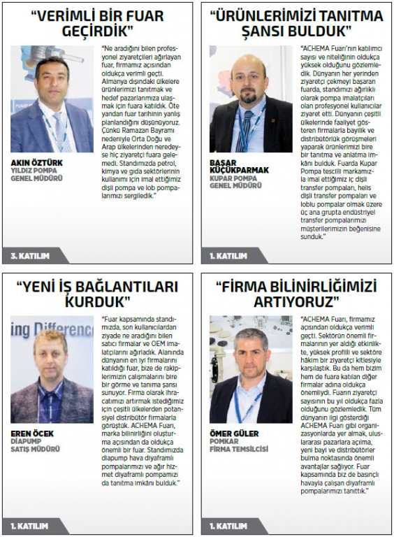 Kimya ve kimya teknolojileri sektörünün dünyadaki en önemli fuarları arasında gösterilen ACHEMA Fuarı, 11-15 Haziran tarihleri arasında Almanya’nın Frankfurt şehrinde düzenlendi. Üç yılda bir gerçekleştirilen fuarda; pompa, kompresör ve vanalar, mühendislik, araştırma, inovasyon, laboratuvar ve analitik teknikler, üretim teknolojileri, kontrol ve otomasyon teknikleri, ilaç üretim, paketleme ve depolama teknikleri, ısıl işlem teknikleri gibi başlıkları temsilen 55 ülkeden 3 bin 803 firma yer aldı.