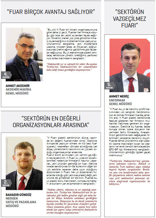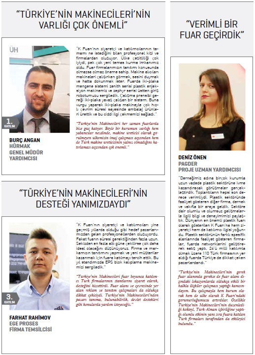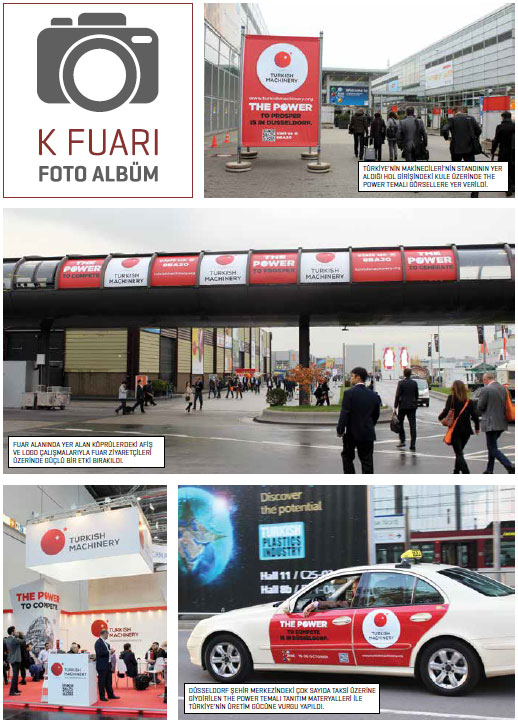 Türkiye’nin Makinecileri Almanya’da gerçekleştirilen plastik ve kauçuk sanayisi fuarı K’da ilk kez yer aldı. Almanya’nın Düsseldorf kentinde gerçekleştirilen fuarda bu yıl, 3 bin 285 firma ürünlerini sergiledi. 160 ülkeden 230 bin ziyaretçinin takip ettiği ve dünyanın en önemli plastik ve kauçuk sanayisi fuarı olan K 2016’ya, 24’ü İstanbul Kimyevi Maddeler ve Mamulleri İhracatçıları Birliği (İKMİB) ve PAGDER işbirliğiyle düzenlenen milli katılım organizasyonu dahilinde olmak üzere, 110 Türk firması katılarak ürünlerini ziyaretçilerin beğenisine sundu.