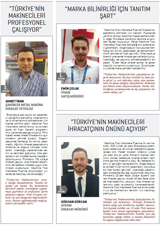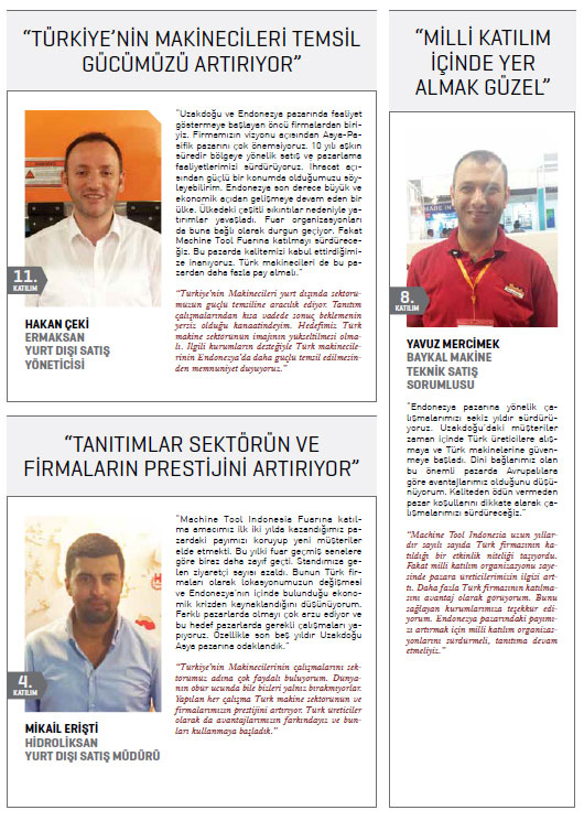 Fuara yeni ismiyle ilk, kurumsal olarak dördüncü kez katılan Türkiye’nin Makinecileri, B1 holünde bulunan 80 metrekarelik iki katlı stantta çalışmalarını sürdürdü. MAİB, Machine Tool Indonesia Fuarına yönelik 2014 yılında olduğu gibi milli katılım organizasyonu düzenledi. Organizasyon kapsamında MAİB üyesi 12 firma fuarda yerini aldı. Fuar hazırlıkları çerçevesinde ülke hakkında genel bilgilerin, ticari ilişkilerin ve dış ticaret rakamlarının yer aldığı bilgi notu paylaşılan firmaların yetkilileriyle fuar süresince koordinasyon halinde hareket edildi. Türkiye’nin Makinecileri fuarda üretici firmalar ve makine sektörünün genel yapısı hakkında bilgi veren broşürler de dağıttı. Fuarda ayrıca Türk firmalarına görüşmelerinde kullanmaları amacıyla kırtasiye seti, stantlarında yer alması amacıyla Türk bayrağı ve Türkiye’nin makinecileri flamaları verildi.
