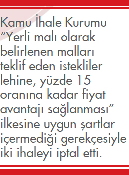 Kamu İhale Kurumu, iki ihaleyi, Başbakanlığın 2011/13 sayılı Genelgesi doğrultusunda yerli ürün lehine avantaj sağlayacak düzenleme yapılmadığı gerekçesiyle iptal etti.