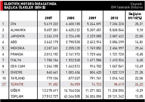 Türkiye ise genel elektrik motoru ihracatında 37’nci sıraya yükseldi. Ülkemizin genel elektrik motoru ihracatı 2009 yılında 75 milyon dolardı. 2010 yılında ise sektör rekor bir artışoranını yakalayarak yüzde 24 pay aldı. Türkiye’nin elektrik motoru ihracatı 2010 yılında 98 milyon dolara yükseldi. Dünya elektrik motoru ihracatında ise 2010 yılında yalnızca bir ülkede azalış görüldü. Fransa yüzde 0,5 oranında geriledi.