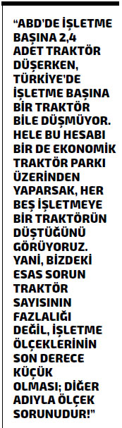 Türkiye ve ABD’de tarımsal işletme sayısı yaklaşık aynı. Bu hesaba göre, ABD’de işletme başına 2,4 adet traktör düşerken Türkiye’de işletme başına bir traktör bile düşmüyor. Hele bu hesabı bir de ekonomik traktör parkı üzerinden yaparsak, her beş işletmeye bir traktörün düştüğünü görüyoruz. Yani, bizdeki esas sorun traktör sayısının fazlalığı değil, işletme ölçeklerinin son derece küçük olması; diğer adıyla ölçek sorunudur! Türkiye’de işletme başına düşen tarım arazisi sayısı 5,9, ortalama parça büyüklüğü ise 12,9 dekardır. Tarımsal işletmelerin yüzde 80,7’si 100 dekardan küçük işletme büyüklük gruplarında yer alıyor. ABD’de ise küçük işletmelerin ortalama arazi büyüklüğü 1810 dekardır.