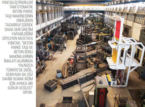 Henüz 15-16 yaşlarında tek başına briket makinesi imal edebilecek düzeye geldiğini söyleyen Mustafa Yontar, “İlkokula giderken babamın yanında çırak olarak çalışmaya başladım ve imalatın inceliklerini çok kısa bir zamanda kavradım. O yıllardaki kadromuz beş kişiden oluşuyordu. İşi sahiplendiğimi ve azimle çalıştığımı gören babam, işlerimizin sorumluluğunu 18 yaşında olduğu gibi bana devretti” diyor. 1979 yılında Silahtarağa’daki fabrikaya taşınmalarıyla birlikte önemli bir atılım ivmesi yakaladıklarını belirten Yontar, firmanın gelişimini ise şu sözlerle özetliyor: “1984 yılında anonim şirket kimliğini aldık ve altyapıya yönelik beton boru ve PTT büz makineleriyle üretim yelpazemizi genişlettik. O günlerde dahi projeli çalışmaya önem veren firmamız, mühendis ekibini her zaman kuvvetli tutmaya özen gösterdi. 1996 yılında Hadımköy’deki fabrikamıza geçişimizle üretim kalitemizle birlikte hızımızı da artırdık ve yakaladığımız sektör liderliğini bir daha da bırakmadık.”