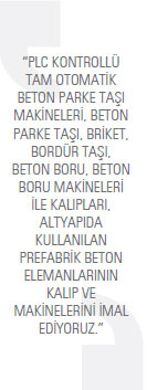 itibarıyla değişik tip ve kapasitelerde PLC kontrollü tam otomatik beton parke taşı makineleri, beton parke taşı, briket, asmolen, bordür taşı, beton boru, beton boru makineleri ile kalıpları, altyapıda kullanılan prefabrik beton elemanlarının kalıp ve makinelerini imal eden Mustafa Yontar, faaliyet gösterdikleri alan