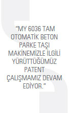 Son yıllarda ülkemizde artan ihtiyaçlar doğrultusunda parke taşı makinelerinin üretimine ağırlık verdik. Hem çevre düzenlemesinde kullanılması hem de yolların parke taşıyla döşenmesinin yaygınlaşmasıyla birlikte seri bir şekilde parke taşı üretimine gerek duyuluyor. Bu ihtiyaç ve talepler doğrultusunda mevcut parke taşı üretim makinelerimize ilave olarak MY 6036 tam otomatik beton parke taşı makinesini geliştirdik. Mevcut makineler ile bir saatte 120 metre taş üretirken yeni geliştirdiğimiz MY 6036 makinemizle aynı sürede 180 metre taş üretmek mümkün hale geldi. Üzerinde iki yıl çalıştığımız yeni makinemizle enerjiden de tasarruf ederek daha seri bir üretim gerçekleştirilebiliyor. Bu yeni ürünümüzde kullanmaya başladığımız kendinden motorlu vibratör sistemiyle hem kayış-kasnak bağlantısının ortaya çıkardığı sorunlar ortadan kalktı hem de değişken hız sistemiyle farklı ürünlerin imalatı daha kolay hale geldi. Bu ürünümüzle ilgili yürüttüğümüz patent çalışmamız halen devam ediyor.