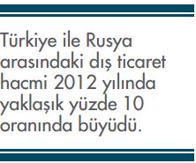 doğal gaz anlaşması çerçevesinde, doğal gaz karşılığında mal ihracı uygulamasının devam ettirilememesidir. Rusya’ya yönelik ihracatımızın artırılması için potansiyel Türk ihraç ürünlerinin ülkede yoğun tanıtımı ve tutundurma faaliyetleri önem arz ediyor. Türkiye’nin Rusya Federasyonu ile dış ticaret hacmi küresel mali kriz nedeniyle 2009 yılında yüzde 39 oranında geriledi. 2009 yılında hem ihracatta hem de ithalatta gerileme gözlendi. 2010 yılında ülkenin küresel krizin olumsuz etkilerinden kurtulmaya başlamasıyla birlikte Rusya’ya ihracatımız arttı. 2010 yılında ihracatımızda yüzde 45, ithalatımızda ise yüzde 11 oranında artış gerçekleşti. 2011 yılında Rusya’ya yönelik ihracatımız 2010 yılına göre yüzde 29,5 oranında, ithalatımız ise yüzde 11 oranında arttı. 2012 yılında da 2011 yılına göre ihracatımız yüzde 11,5 artarak 6,7 milyar dolar seviyesine yükseldi. Aynı dönemde Rusya’dan gerçekleştirdiğimiz ithalat bir önceki yıla göre yüzde 10,8 artarak 26,6 milyar dolar olarak kaydedildi. TürkiyeRusya dış ticaret açığı bir önceki yıla göre yaklaşık yüzde 11 oranında arttı. Türkiye ile Rusya arasındaki dış ticaret hacmi 2012 yılında yaklaşık yüzde 10 oranında büyüdü.
