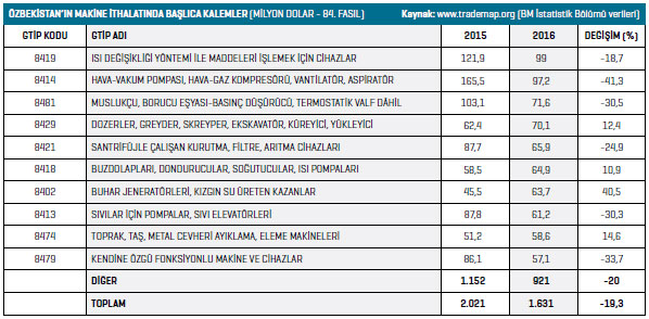 Özbekistan’ın makine ithalatındaki ilk 10 ürün grubu içerisinde en yüksek artış ise 8402 GTİP kodlu “Buhar jeneratörleri, kızgın su üreten kazanlar” ürün grubunda oldu. Bu ürün grubunda 2016’da yüzde 40,5’lik artışla 63,7 milyon dolarlık ithalat gerçekleştirildi.