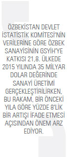 Ülkenin sanayi geçmişi ise yine SSCB dönemindeki planlı ve potansiyele uygun yatırımlar nedeniyle güçlü bir görünüm sergiliyor. Bununla birlikte, bağımsızlık sonrasında geBÜYÜME İVMESİ GÜÇLÜ 2015 yılı Gayri Safi Yurt İçi Hasılası (GSYİH) bir önceki yıla göre yüzde 8 büyüyen Özbekistan’da GSYİH içinde özel sektörün payı ise yüzde 82,9 olarak gerçekleşmişti. Son beş yılda ortalama yüzde 8,1 oranında büyüyen ülke, hızlı büyümesini ise güçlü iç ve dış talep ile gerçekleştiriyor. Özellikle yurt dışında çalışan Özbek işçi vatandaşlarının gönderdiği dövizler (GSYİH’nin yüzde 15’i) ve ülkenin ihraç mal fiyatlarının (altın ve hidrokarbon) dönemsel olarak yüksek seyretmesinin etkisiyle tüketim ve gayrimenkule yatırım canlılığını koruyor.