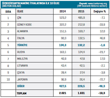 Özbekistan’ın 2016 yılı makine ithalatında Çin, Güney Kore ve Almanya ilk üç sırayı paylaşırken, Türkiye, Özbekistan’ın makine ithalatı gerçekleştirdiği ülkeler içerisinde İtalya’nın ardından beşinci sırada bulunuyor. BM İstatistik Bölümü verilerine göre Özbekistan, geçtiğimiz yıl Türkiye’den yüzde 1,6’lık düşüşle 132 milyon dolar değerinde makine ithal etti.