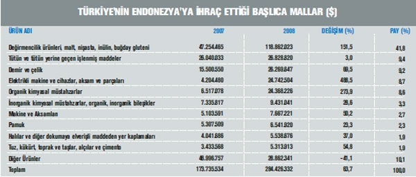 Türkiye ile Endonezya arasındaki KEK toplantıları neticesinde, iki ülke arasında gümrük, sanayi, standardizasyon, ulaştırma, tarım, doğ al afetler, enerji, bankacılık, turizm ve ihracatı geliştirme alanlarında işbirliği öngörülmüş olup konuya ilişkin çalışmalar anılan toplantı lar bağ lamında devam ediyor. İki ülke arasındaki 1999 yılında 194 milyon dolar olan toplam dış ticaret hacmi 9 katına çıkarak 2008 yılında 1,7 milyar dolara ulaştı. 2008 yılında 284 milyon dolar ihracata karşılık, Endonezya’dan 1,4 milyar dolar ithalat yapan Türkiye dış ticaret açısından açık verdi. Bu dış ticaret açığ ı 2008 yılında 1,1 milyar dolar civarı nda gerçekleşti. Diğer taraftan, 2008 yılında Endonezya’ya olan ihracat yüzde 63,7 artarken, Endonezya’dan ithalat yüzde 3,6 oranında artış sergiledi. İki ülke arasında dış ticaretin daha yakından incelenmesi amacıyla mal grupları bazı nda verilere bakıldığında; 2008 yılında Türkiye’nin Endonezya’ya yaptığı toplam ihracat içinde en büyük paya sahip olan fasılın 118 milyon dolar ile “değirmencilik ürünleri, malt, nişasta, inülin buğ day gluteni” olduğu (esasen buğday unu) görülüyor. Bu ürün grubunu, “tütün ve tütün yerine geçen işlenmiş maddeler” ile “demir ve çelik” izliyor. 2008 yılında Türkiye’den Endonezya’ya ihracat 84’üncü fasılda bulunan “makine ve aksamları” 7’nci sırada yer aldı. Söz konusu ülkeye, makine ve aksamları ihracatı nda ülke sıralamasında gerilerde bulunmakla birlikte, sektör açısından ihracatın gelişme kaydettiği potansiyel bir pazar niteliği taşımaktadır.