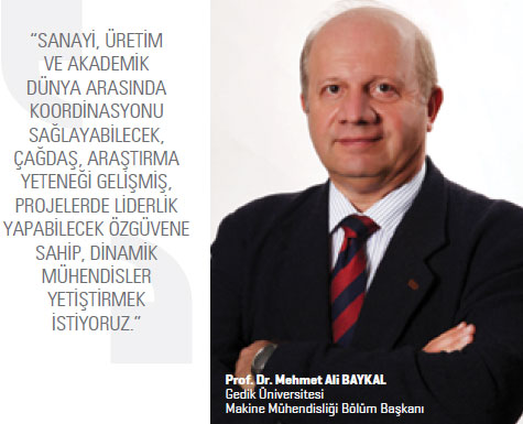 Mühendislik etiğini özümsemiş, global olarak sanayi, üretim ve akademik dünya arasında koordinasyonu sağlayabilecek; çağdaş, araştırma yeteneği gelişmiş, projelerde liderlik yapabilecek özgüvene sahip, dinamik mühendisler yetiştirmenin temel hedefleri olduğunu belirten Gedik Üniversitesi Makine Mühendisliği Bölüm Başkanı Prof. Dr. Mehmet Ali Baykal, bölümün kuruluşundan itibaren hem altyapı olanakları, hem de akademik kadro açısından hızlı bir gelişim gösterdiğini söyledi. Gedik Üniversitesi Makine Mühendisliği Bölümünün farklı sanayi projeleri üzerinde çalışmayı sürdürdüğünü aktaran Prof. Dr. Mehmet Ali Baykal, bölümün yapısı, kuruluş amaçları ve hedefleriyle ilgili bilgi verdi.