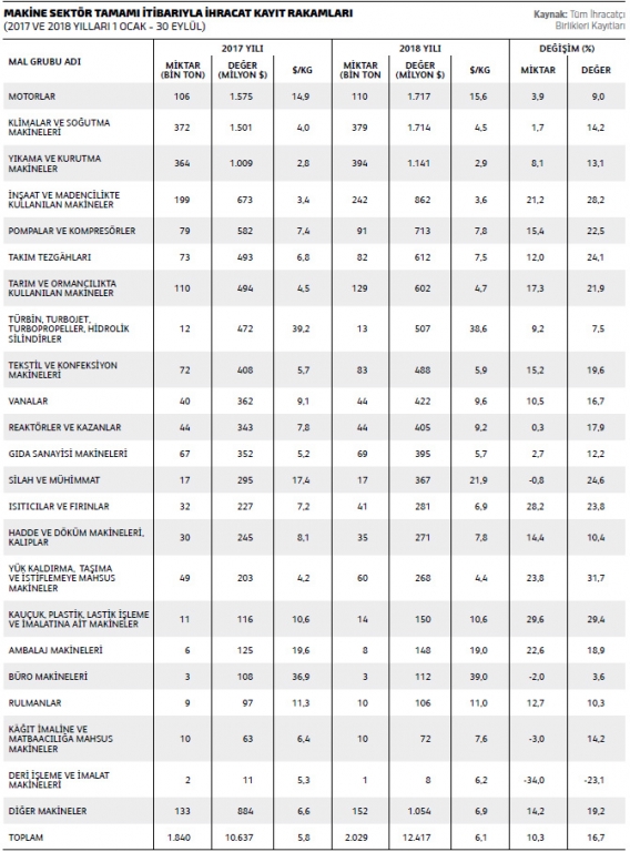 TÜRKİYE’NİN MAKİNE İHRACATI 2018 YILININ OCAK-RYLÜL DÖNEMİNDE 12,4 MİLYAR DOLAR OLARAK KAYDEDİLDİ. 2017 YILININ AYNI DÖNEMİNDE BU RAKAM 10,6 MİLYAR DOLAR SEVİYESİNDEYDİ. TÜRKİYE’NİN MAKİNE İHRACATI, EYLÜL AYI SONUNDA, GEÇEN YILIN AYNI DÖNEMİNE GÖRE YÜZDE 16,7 ARTTI.