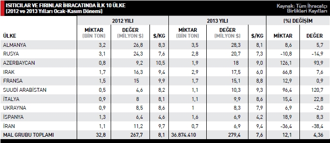 Isıtıcılar ve fırınlar ihracatı 2013 yılının Ocak-Kasım döneminde bir önceki yılın aynı dönemine göre yüzde 4,3 artış...